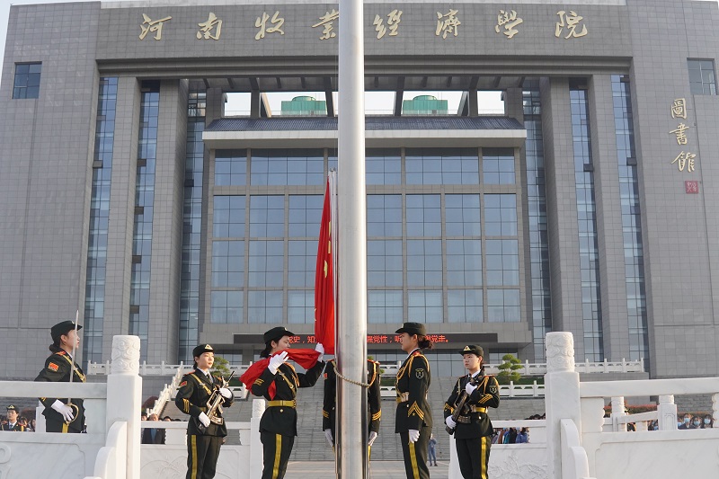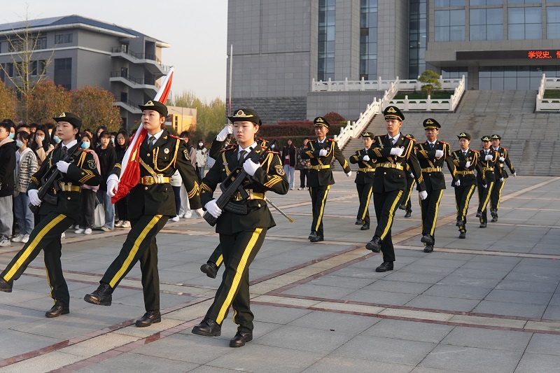 在铿锵有力、整齐划一的脚步声中,国旗仪仗队来到升旗台前护卫国旗。在雄壮的义勇军进行曲中,五星红旗冉冉升起。在场师生庄严站立,面向五星红旗高唱国歌。