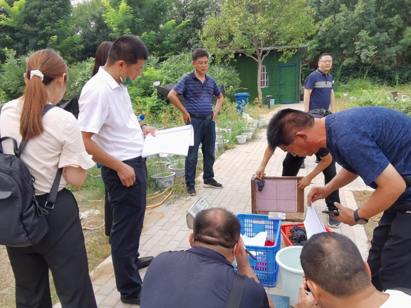 王鹏老师向专家组详细介绍了该酿酒葡萄新品种的培育过程、品种的特征、品种的习性,专家组审阅了品种选育报告,并对该品种的果穗大小、果粒大小、果粒颜色、果皮与果粉厚度、可溶性固形物含量、研磨色泽、果实风味以及单株产量和亩产进行了现场检测,为品种登记保护和审定提供依据。
