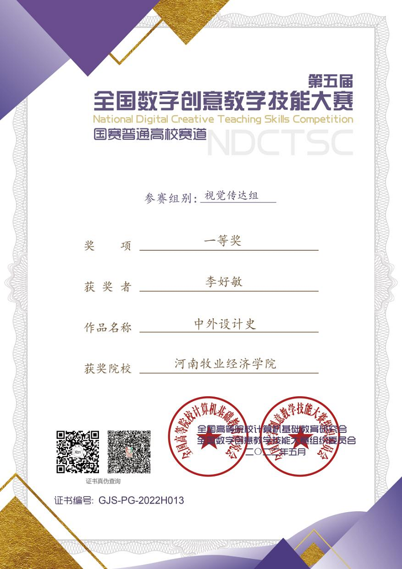 pg娱乐电子游戏官网教师李好敏在第五届全国数字创意教学技能大赛[普通高等院校赛道]中,获视觉传达设计组一等奖。据官方公示数据,第五届全国数字创意大赛共设立了30个分赛区共收到507所普通高等院校的3500余位教师的投稿作品,最终推荐898部优秀作品进入全国决赛。