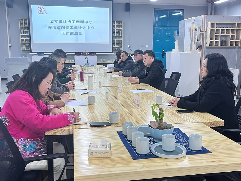 2023年2月17日下午,pg娱乐电子游戏官网入口在龙子湖校区尚严楼pg娱乐电子游戏官网入口陶瓷创研中心召开“艺术设计协同创新中心及河南省陶瓷工业设计中心”工作推进会。副校长杨国宇、科学技术处处长潘春梅、亚坤集团监事会主席、徽汝汝瓷总经理曹二虎、九和包装总经理王伟峰、河南省陈设艺术协会主席曾志刚、秘书长韩婧、pg娱乐电子游戏官网入口领导班子成员、协会代表参加研讨会。会议由pg娱乐电子游戏官网入口党委书记王国辉主持。