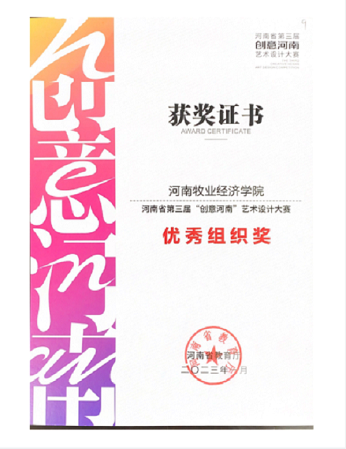 近日,由河南省教育厅主办的河南省第三届“创意河南”主题作品艺术设计大赛圆满结束。此次大赛组委会收到参赛作品 3100余件(套), 经评审和公示,共有 503件(套)作品分获金、银、铜奖,208件(套)作品获优秀奖;另评选出 61个优秀指导教师奖,10个最佳设计师奖,40个优秀组织奖。pg娱乐电子游戏官网入口对此次比赛高度重视,广泛宣传,精心组织,积极参与,在专业组中,张鹏、董晓峰、卜可、李好敏4位老师获得金奖,白海萍、王霜2位老师获得银奖,卞卡老师获得优秀奖;在老师的精心指导下,学生作品在众多参赛作品中脱颖而出,张梦瑶、杨盼盼、岳辰羽、路钧超、李文玉、郭浩源等6位同学获得金奖,朱冰倩、张启蒙、赵银俊等3位同学获得银奖,毛晴、高彦飞、窦瑞霞、程同、白梦雪等5位同学获得铜奖,冯亚敏、袁志慧、申兆梁、唐一巧、孙理、路钧超等6位同学获得优秀奖;陈胜蓝老师获得优秀指导教师奖;学校获得优秀组织奖。