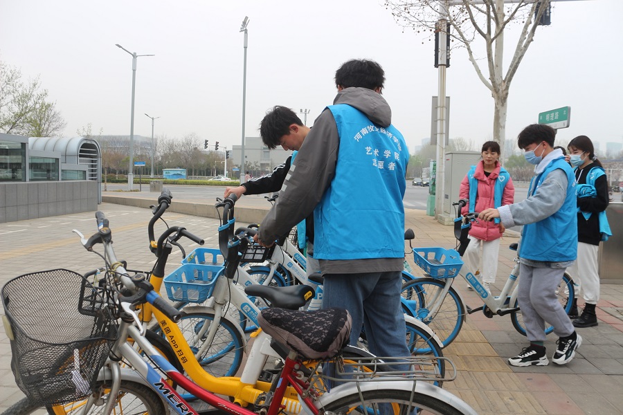 25名志愿者在学校西门集合。活动开始后,pg娱乐电子游戏官网入口青年志愿者们先来到了距离学校最近的文苑北路地铁站。在活动开展过程中,志愿者们积极整理零散的单车,把倒下的单车扶起来,然后按照共享单车的摆放地点,对不规范停放的单车进行规范停放,距离停靠点远的单车,志愿者们就两两结对搬运到停放点,经过一下午的劳动,把龙子湖周边的单车都规整了一遍,此次活动圆满结束。