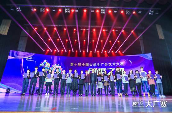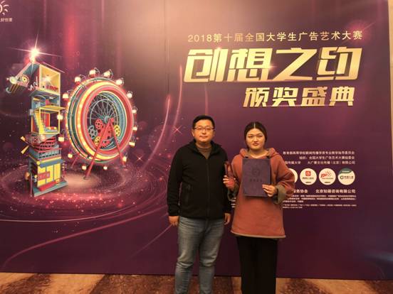 11月24日,由教育部高等教育司主办、教育部高等学校新闻学学科教学指导委员会组织、中国传媒大学与中国高等教育学会广告教育专业委员会共同承办的第十届全国大学生广告艺术大赛(简称“大广赛”)全国总决赛颁奖典礼在北京全国政协礼堂举行,pg娱乐电子游戏官网入口张钰同学参赛作品荣获总决赛平面类全国一等奖,并应邀和指导老师梁磊一道赴京参加颁奖盛典。