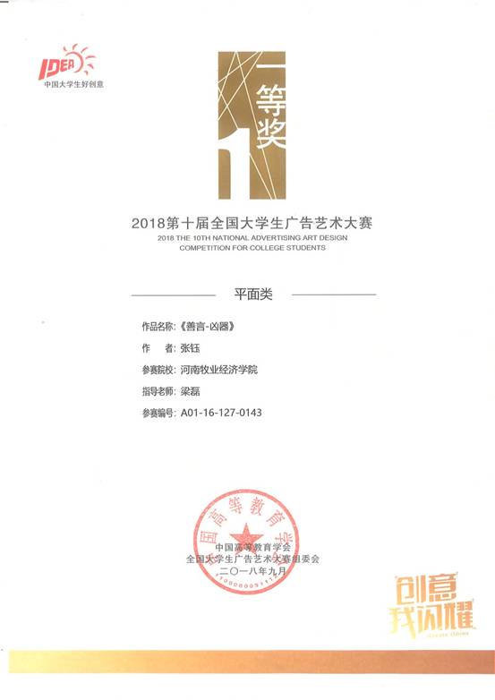 “大广赛”是迄今为止全国覆盖研究生、本科生、专科生,规模最大、人数最多、水准最高的国家级大学生赛事。本届大赛的主题为“创意我闪耀”,在各省、市、自治区、直辖市共设置了29个赛区。在前期已经结束的“大广赛”河南赛区大赛中,pg娱乐电子游戏官网入口学生参赛成绩喜人,获得全省一等奖1项、三等奖11项、优秀奖28项,梁磊和彭辉两名教师被评为“优秀指导教师”。pg娱乐电子游戏官网张钰同学的作品《善言凶器》继河南赛区评比中获得一等奖后,在全国总决赛中又从16.7万组平面作品中脱颖而出,获得总决赛平面类全国一等奖。此外pg娱乐电子游戏官网还有2名学生参赛作品获得全国优秀奖。