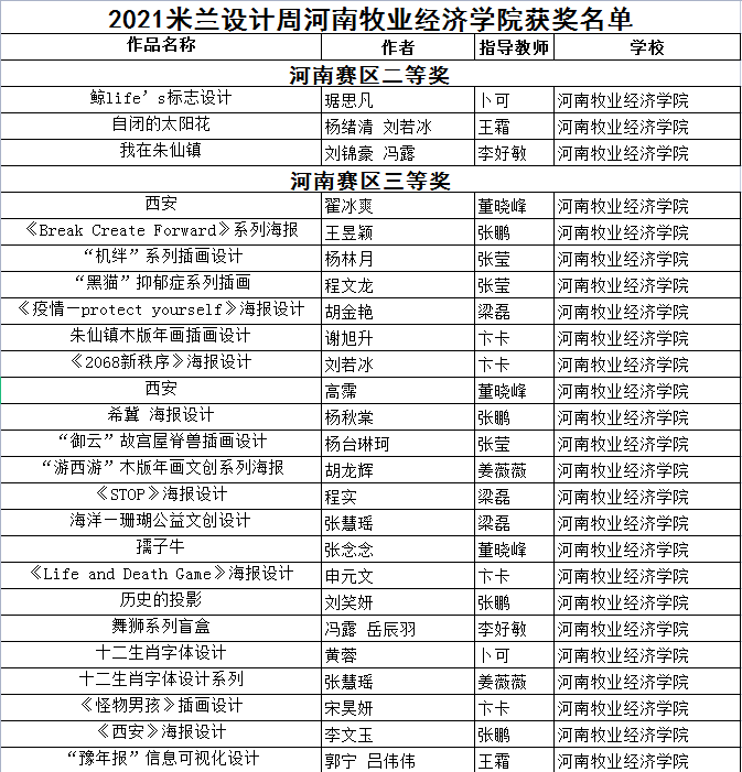 在近期落下帷幕的2020米兰设计周—中国高校设计学科师生优秀作品展中,pg娱乐电子游戏官网入口视觉传达专业师生取得了骄人成绩,共获得河南省赛区省级一等奖1项、二等奖7项、三等奖22项。