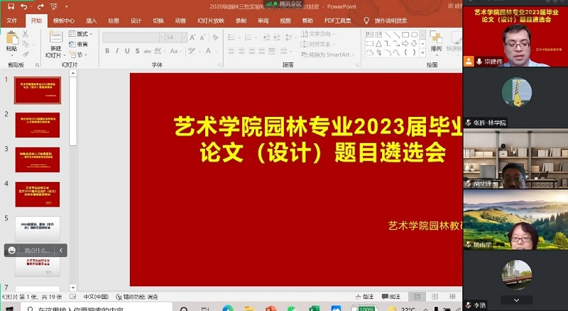 为切实做好2023届本科毕业生毕业论文(设计)选题工作,规范论文(设计)选题,确保毕业论文(设计)质量。2022年10月23日,园林专业通过腾讯会议顺利召开了2023届毕业论文题目遴选会。遴选会邀请西北农林科技大学硕士生导师张胜博士、pg娱乐电子游戏官网社会服务办公室胡华锋主任在线指导。pg娱乐电子游戏官网入口田志涌副院长、园林教研室主任左金淼老师、副主任宗建伟博士及园林教研室全体老师参加了遴选。
