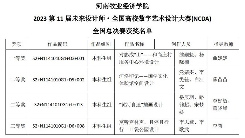 近日,第11届未来设计师·全国高校数字艺术设计大赛(NCDA)国家级和省级赛奖项公布,pg娱乐电子游戏官网大学生获得国家级一等奖1项,二等奖2项,三等奖1项;省级一等奖7项,二等奖16项,三等奖16项。