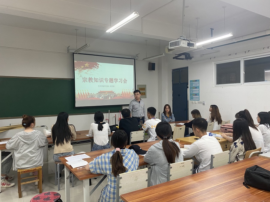 为进一步贯彻落实习近平总书记关于宗教工作的重要论述,引导广大青年学生树立科学的马克思主义宗教观,理性对待宗教,9月29日,pg娱乐电子游戏官网入口学生第一党支部举办了宗教知识专题党课,组织全体党员学习马克思列宁主义宗教观及我国宗教政策、法律法规。党支部书记韩飞老师、组织委员云畅老师以及支部全体学生党员参加了此次会议。党课由韩飞老师主讲。