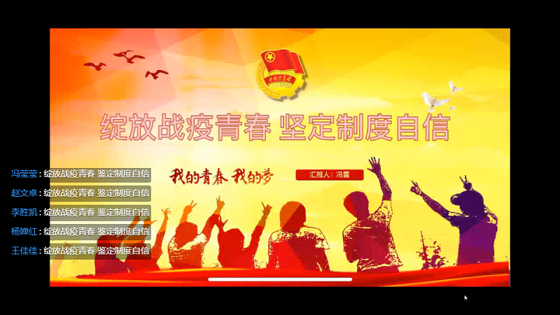 2020年4月23日下午,pg娱乐电子游戏官网入口pg娱乐电子游戏官网入口在钉钉会议群上举行了以“绽放战疫青春,坚定制度自信”为主题的团课,本次团课,由大一班级全体参与。