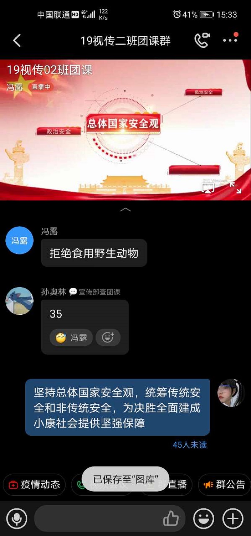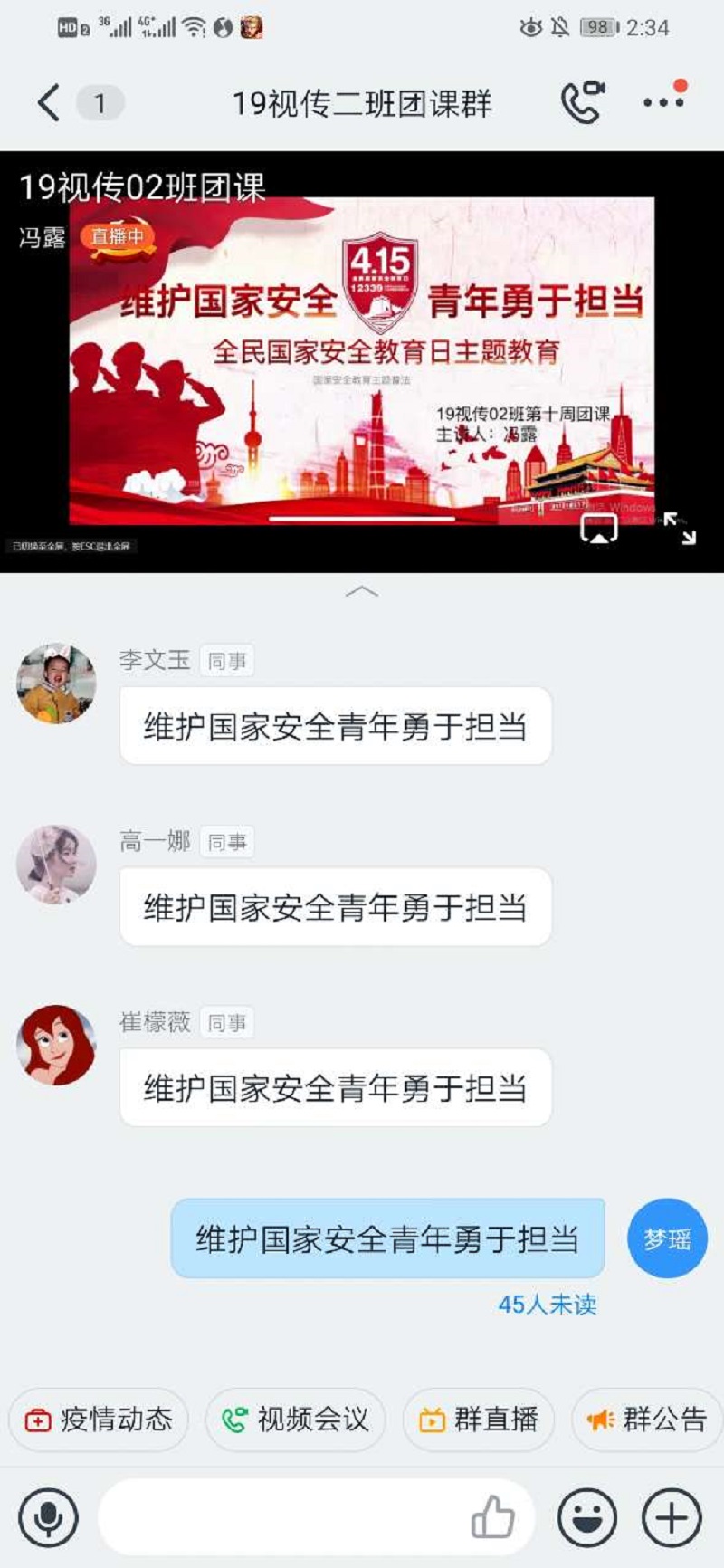 通过本次团课,同学们受益匪浅,感受深刻,让同学们更加清晰的认识到新冠病毒的危害和防护措施,一些看似小事也关系到国家安全国家安全,我们应当提高自己的防范意识,为国家安全献出自己的一份力量。